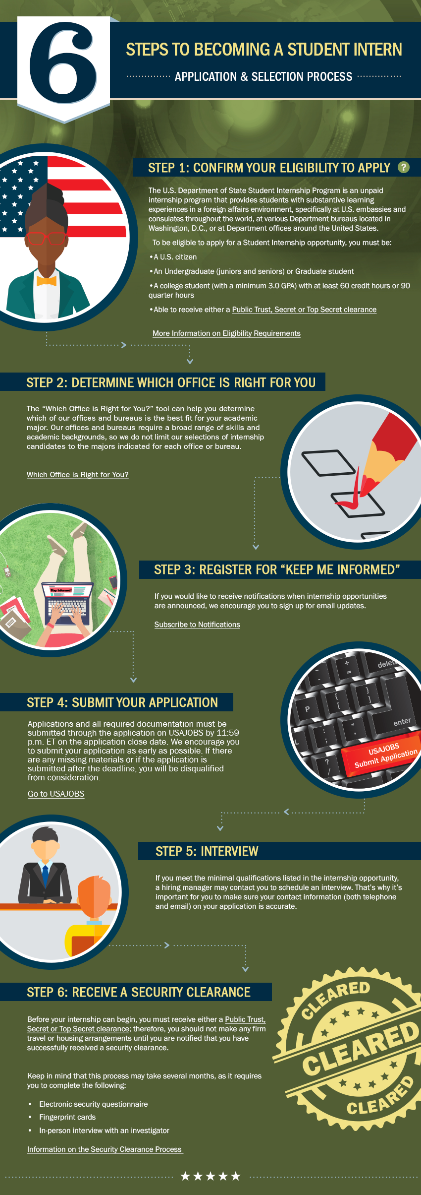 Each internship opportunity lists the responsibilities of the internship, but interns may be assigned to do research on political, economic, environmental or other issues. They may write reports and correspondence; assist with citizens' services or visa work; or use their expertise in information systems, procurement, or budget and fiscal operations. Some may help to organize a conference or a visit of high-level officials. Some interns write news stories, work on web pages, or help produce electronic journals. Others may be involved in educational and cultural exchange activities. Interns also help in the recruiting of U.S. speakers and specialists for overseas programs.